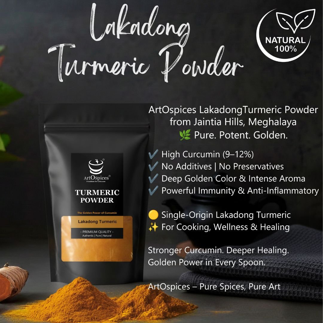 ArtOspices brings you pure, single-origin Lakadong turmeric, carefully processed to preserve its natural potency, aroma, and nutrients. Free of additives and preservatives, this turmeric powder delivers exceptional taste and wellness benefits with every spoonful.